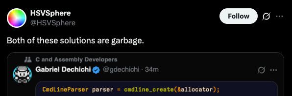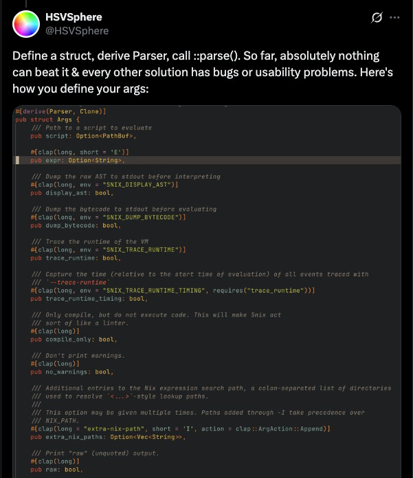 To start, the HSVSphere guy kinda has a point. It’s kinda nice to just define macros on top of a struct and get type-safe arguments. I’d argue it’s “clean” as well, in the sense that you can look at this struct and see every argument your program supports.